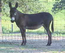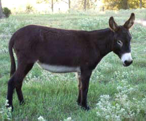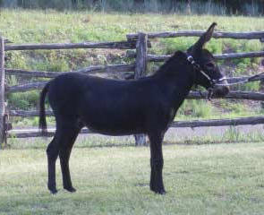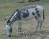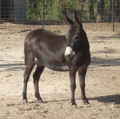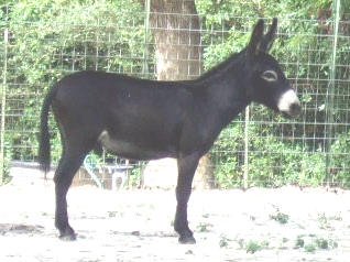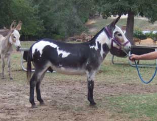 Tangueray is our 'go-to' man! He loves to pasture with a small herd of jennys to call his own. He is very well-mannered and never gets out of line or rough with his ladies. He will produce beautiful black foals with fabulous 'Betty Grable' eyes when bred to dark brown jennys, and he is also a consistent producer of dark spotted foals when bred to spots!