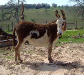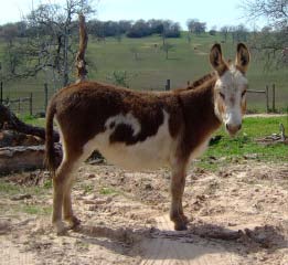 In addition to great conformation, Shawnee has an eye-catching color pattern. We showed her once as a yearling at the big 2010 Texas Shoot Out, and she brought home a second place ribbon in a spotted halter class with donkeys all ages, all genders and all sizes. We were delighted! Shawnee's sire is an outstanding performance donkey, and her dam is a wonderful brood jenny. In addition to the Cobra and Short Asset bloodlines, Shawnee's pedigree carries My World, Windcrest and Rearview; she definitely has the right credentials! Around the farm, she is