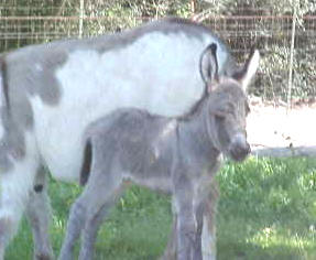 Sherry and her sister have plans to open a bed & breakfast and included in their plans is an area where their guests can interact with their animal family! Guess what ......... Lani Girl and Roxanna have been "hired" to be their official PR reps! Lani has the most wonderful disposition and loves to be as close to your side as possible. She has been bred to our little spotted jack, Major Moneymaker, for an early fall 2004 foal; this will be her first baby, and what a delightful addition to their plans! Don't you know their guests will be delighted when they are greeted by these two fun-loving little jennys! |